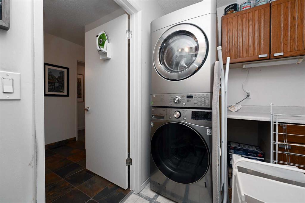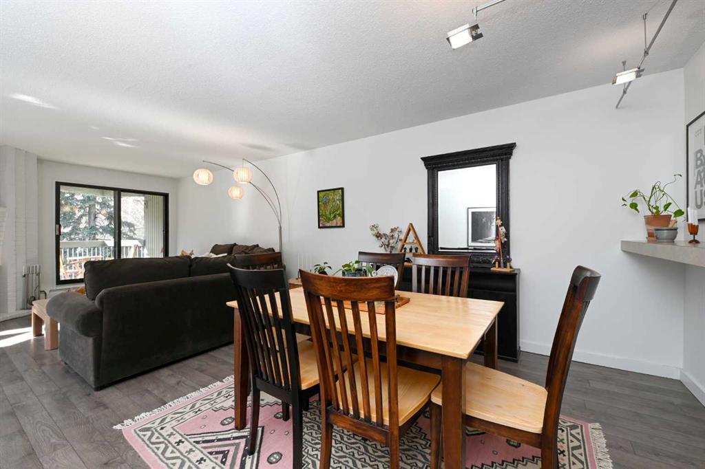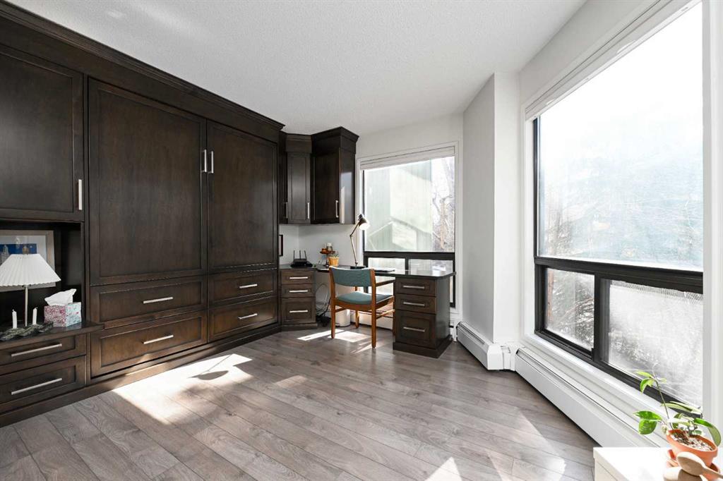 Park-front living and a thoughtfully updated interior come together in this spacious inner-city residence spanning over 1,025 sq ft of functional, well-designed space. Positioned directly across from green space along a quiet street, daily life feels connected to nature while remaining steps from Calgary’s most vibrant amenities. An open-concept layout unfolds with seamless flow that encourages both everyday living and effortless entertaining, anchored by a modern kitchen finished with stainless steel appliances, full-height cabinetry and a peninsula island with a breakfast bar that naturally brings people together. A centrally placed dining area enhances connectivity without interrupting sightlines, creating an ideal setting for hosting or casual meals. Relaxation is welcomed in the bright living room where a fireplace adds warmth and large windows draw in natural light throughout the day. Patio sliders extend living outdoors to a covered balcony overlooking the park, creating a peaceful backdrop for morning coffee or evening unwinding. An open den area introduces exceptional flexibility with a built-in workspace and a Murphy bed that easily adapts to guest stays and a productive work-from-home setup without compromising living space. The generous proportions continue into the primary bedroom where dual walk-through closets with built-in organizers lead to a stylish 4-piece bathroom finished with heated slate flooring for added comfort and a full-height subway tile surround that elevates the space. A spacious walk-in laundry and storage space enhance everyday convenience and organization. This quiet, solid low-rise building has just 25 units and features a recently modernized elevator while an assigned off-street parking stall adds practical value to this low-maintenance lifestyle. Ideally located mere steps to 4 Street’s cafes and restaurants, a short walk to trendy 17 Avenue, the serene river pathways and Repsol Sport Centre, balancing vibrant city living with a quiet, park-side setting. A refined blend of space, flexibility and location creates a home that adapts effortlessly to both daily living and urban exploration!