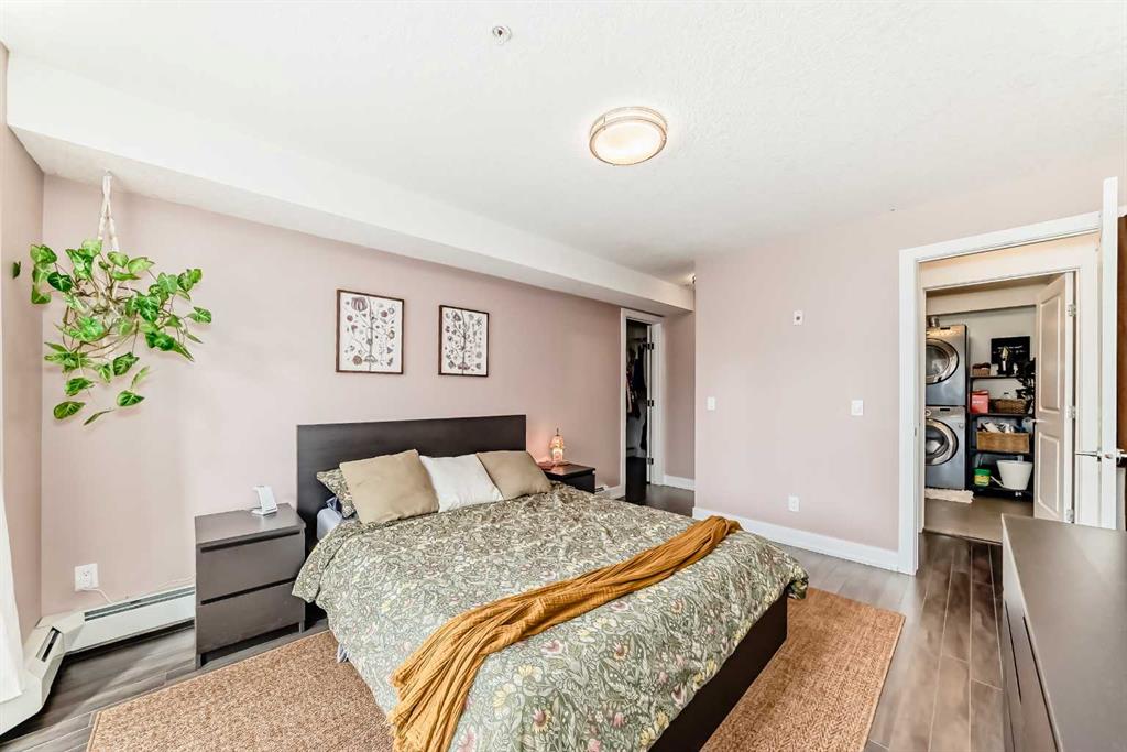 Location! A beautiful and bright 2 bedroom + 2 bathroom apartment located minutes from Downtown Core and LRT station. Close to Trendy Shops, Pubs, Restaurants and Bike Path that runs along the Bow River. This unit offers just under 1000 sqft and an open concept with a great floor plan! Large master bedroom with an en-suite bathroom and a walk-in closet. The second bedroom also has a walk-in closet and a Jack and Jill bathroom. The laundry and storage are both within the unit adding privacy and functionality. The unit comes with a titled underground parking stall. Close to restaurants, shopping, schools and transit. The condo fees includes heat & water.