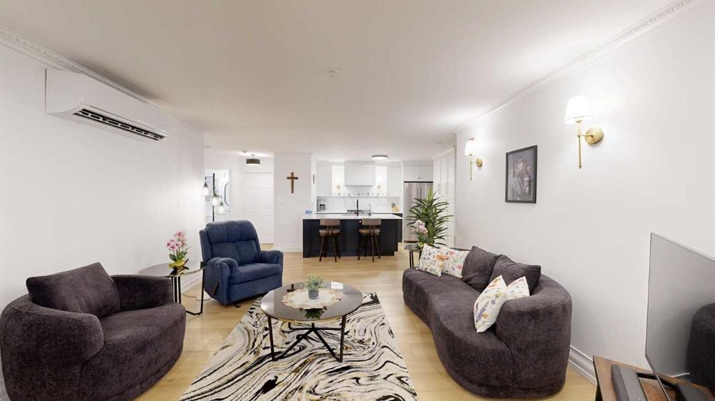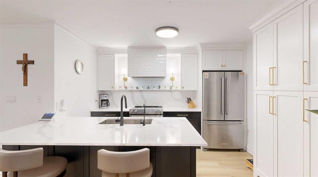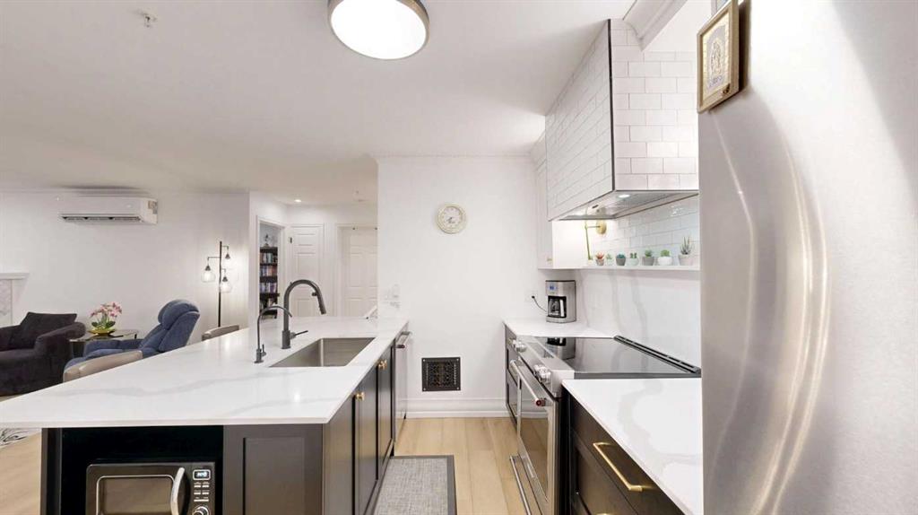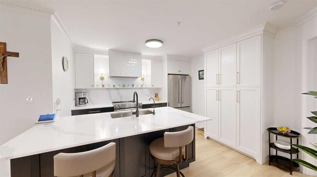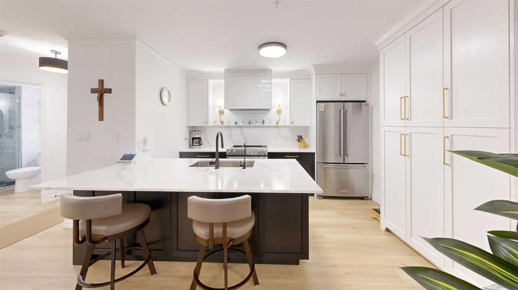 *** OPEN HOUSE - SUNDAY, APRIL 26th, 2 to 4 pm *** Welcome to a contemporary, modern and newly renovated EXECUTIVE ORNATE condo located in the sought after and desirable Eau Claire neighborhood. This spacious ground-floor unit offers an exceptional blend of ultra modern convenience and urban lifestyle, right in the center of Calgary’s energetic downtown. Inside you will find an open-concept living space filled with an abundance of south facing natural light, accompanied by high ceilings and large windows. The well-appointed kitchen features sleek white custom kitchen cabinetry, quartz countertops and custom backsplash, newer stainless-steel appliances, and a scintillating receptive island, excellent for casual dining and entertaining. This unit includes a spacious primary bedroom with ample closet space and a stylish bathroom featuring ultra modern fixtures. Additional highlights include newer plumbing, and upscale lighting.