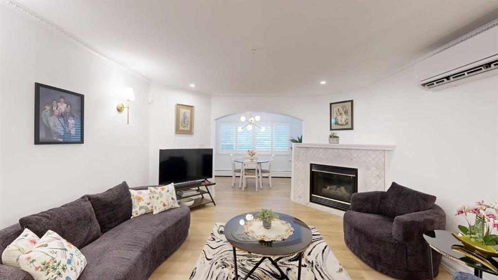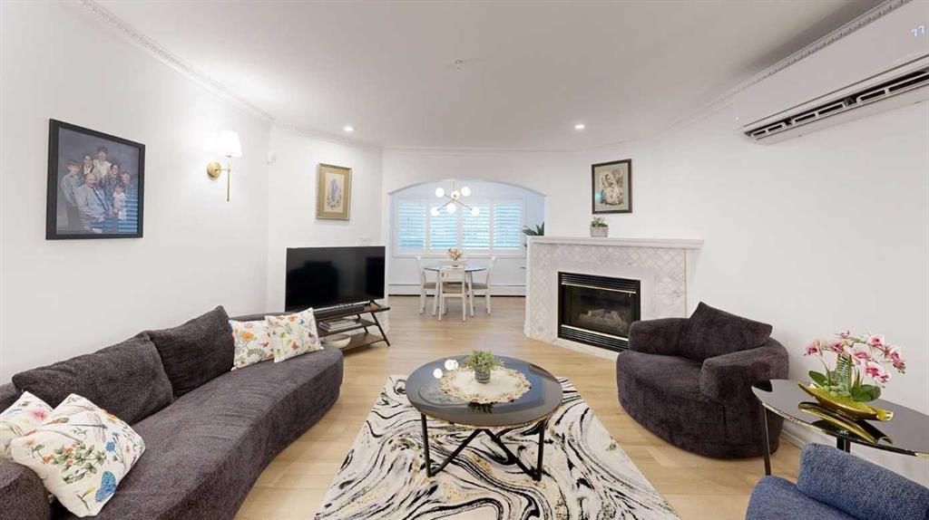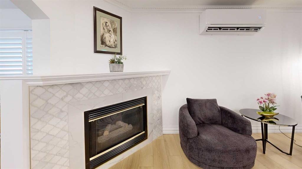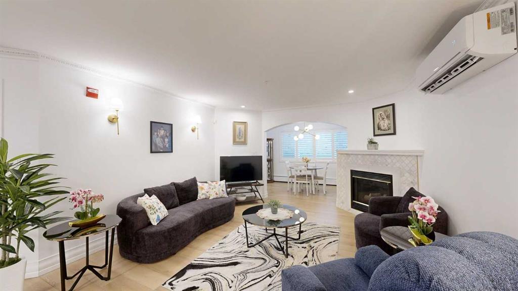 Smooth ceilings, crown molding, new custom high-end shutters and a newer air conditioning unit. Pipe drawer vanities with an updated fireplace surround with mantle, newer stacked LG washer and dryer, and updated closet interiors. Charming character trim work, in-suite laundry, ample storage, and secure underground titled parking with storage.