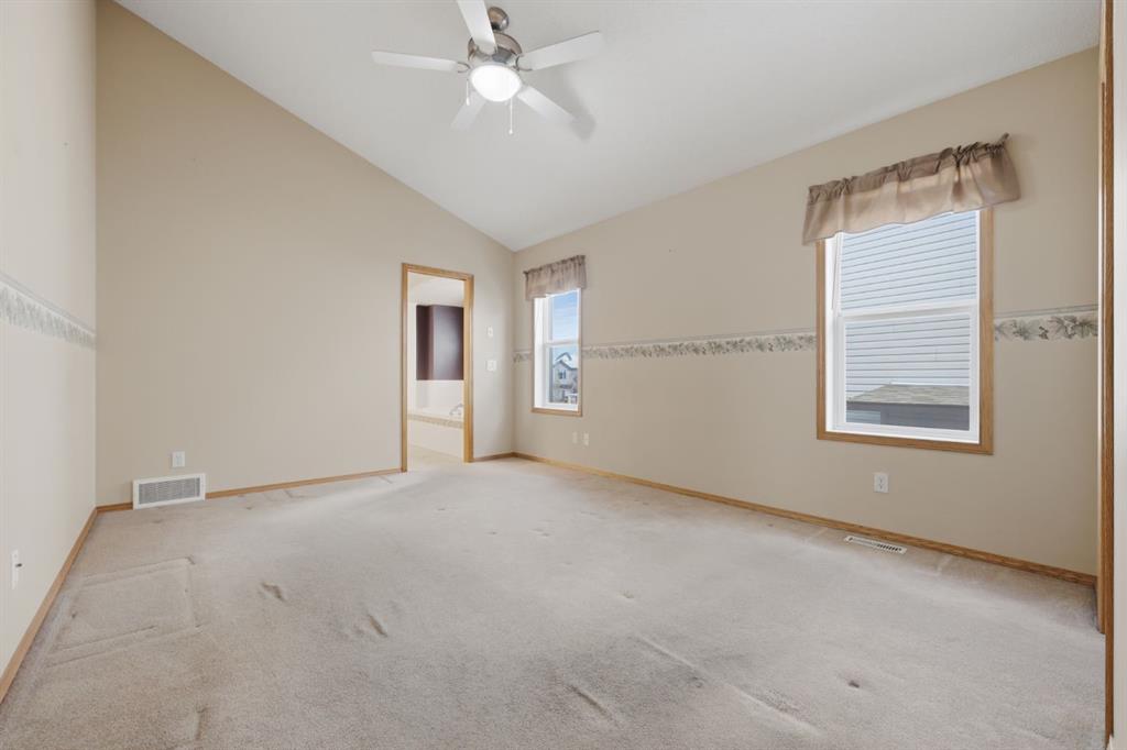 The primary bedroom is generously sized with vaulted ceilings, a walk-in closet, and an ensuite with a soaker tub and separate shower. Downstairs, the fully developed basement feels bright and open thanks to high ceilings and large windows. The expansive recreation space offers endless flexibility- ideal for a movie room, games area, or fitness setup- along with two additional bedrooms, a full bathroom, and ample storage.
