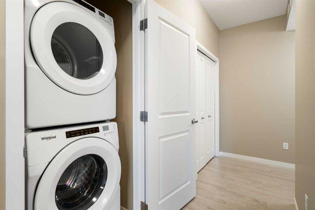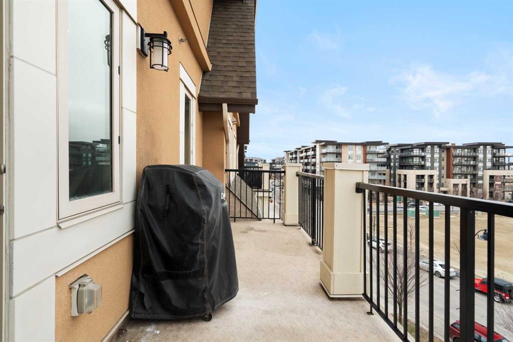 Your opportunity to make your next home in Sandgate, a great condo complex in the highly desirable lake community of Mahogany. This well designed and upgraded 2-bedroom, 2-bathroom corner unit with 900 sq. ft. of living space located on the top floor with a southwest exposure is a rare find. As you approach the unit, you will notice it is located at the end of the wide hallway, being one of 2 units sharing the entire end of the building. Open the door and you will experience the bright crisp freshness of this contemporary home. The 9’ knock down ceilings, laminate flooring, and 2 closets for plenty of storage are great features. A few steps forward and you will be in the open living area with a 10’ ceiling and many windows flooding the space with natural light. Take a look at the gourmet kitchen. There is a massive island with breakfast bar, white quartz counter tops, an abundance of upgraded shaker cabinets with tall upper cabinets, soft closing doors and drawers, an abundance of pot drawers with under-mounted rollers, stainless steel appliances and a water purifier. The generous living room opens to the south facing large balcony with gas line and barbeque. A wall mounted air conditioner with separate compressor keeps the living area comfortable on those wonderful summer days. Wide slat venetian blinds throughout the unit provide the option to block out the light and heat. The spacious primary bedroom features a large walk-through closet and a 3-piece en-suite bathroom with quartz counter, tile floor, walk-in shower and a medicine cabinet. On the opposite side of the unit there is a second bedroom located beside a 4-piece bathroom with quartz counter, tile floor and a medicine cabinet. The stacked front-loading washer/dryer complete this wonderful home. Lightly lived in and well maintained, this unit has been professionally repainted in neutral colours and is move-in ready. There is a titled underground parking stall with a caged storage locker just down the stairwell beside this unit or take a short walk and ride the elevator. The complex offers a bicycle storage room, fitness center in building 10 and 2 guest suites. All this is located within walking distance of the heart of Mahogany with shops, services and all of the lake amenities including a clubhouse, swimming, skating, tennis courts, fishing and so much more. You have easy access to Stoney Trail and only minutes to the South Calgary Health Campus, Brookfield YMCA, public library and the future LRT station. Check it out today!